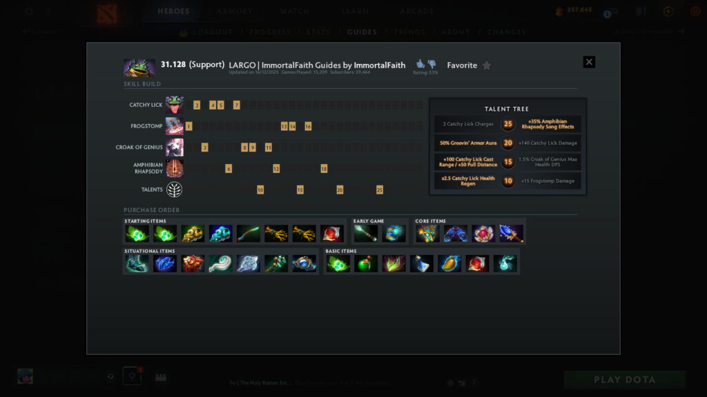 Cependant, Largo étant encore relativement récent dans Dota 2, il est possible d’expérimenter des configurations originales, comme le joueur en offlaner ou en tank pour voir ce que cela peut donner. Vous trouverez ci-dessous la configuration de support la plus pertinente pour Largo.