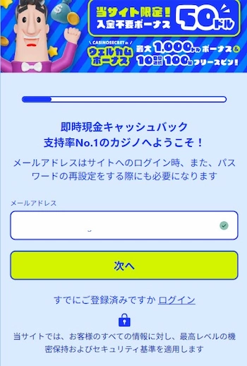 獲得方法は、当ページに掲載されているカジノシークレットのリンクをタップして新規登録を行うだけ。登録完了後、$50の入金不要ボーナスがアカウントに反映されます。