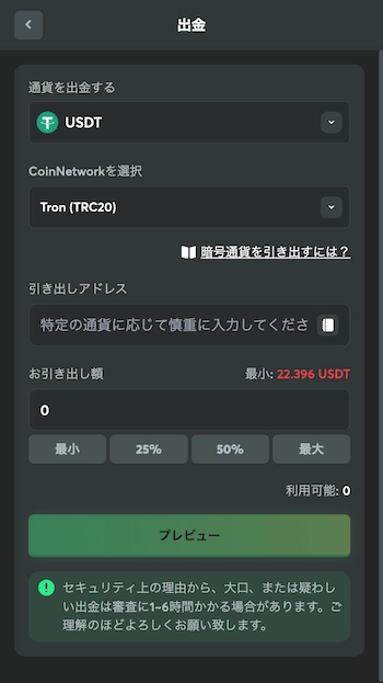ネットワーク(TRC20/ERC20)は出金先と必ず一致させる必要があります。
