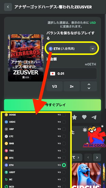 入金が反映されたら、プレイするゲームを選び、使用する仮想通貨を指定します。