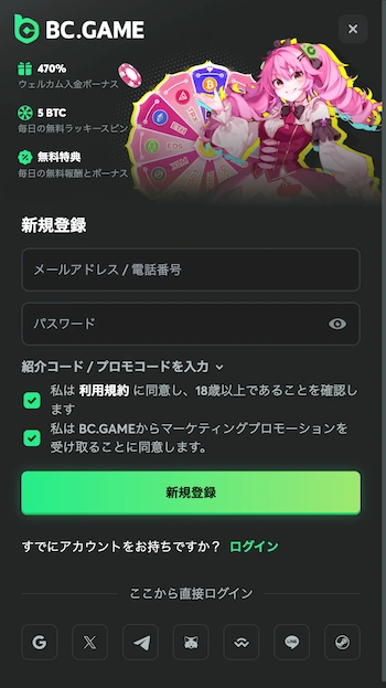 登録はメールアドレスまたは電話番号とパスワードのみで完了し、KYC(本人確認)を省略できる匿名性の高い設計となっています。