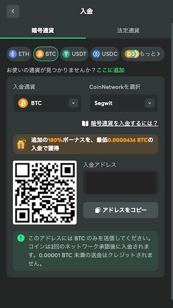 入金画面から希望通貨を選択し、「入金アドレス」または「QRコード」から仮想通貨を送金します。