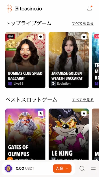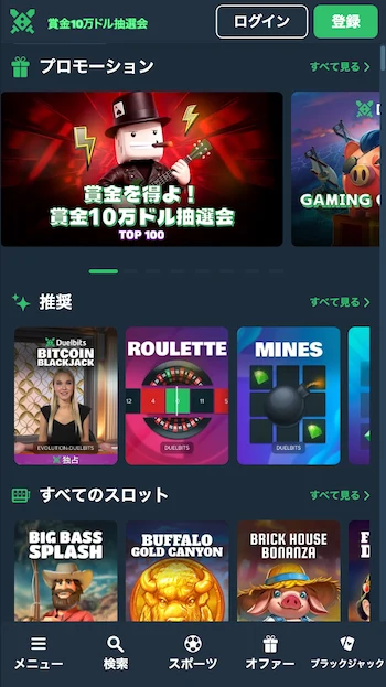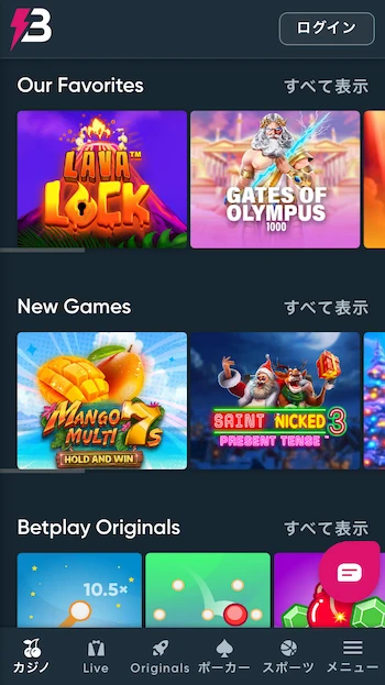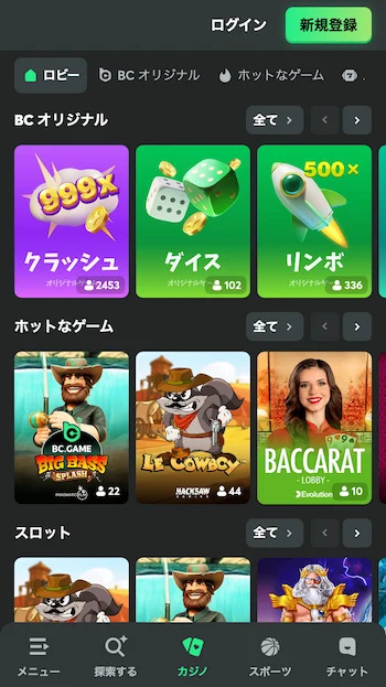 スロット、ライブカジノ、クラッシュ系など3,300種類以上を提供し、独自の「Originals」シリーズや共同開発による限定タイトルも展開しています。RTP(還元率)が高く、動作も軽快で、シンプルながら完成度の高いゲーム環境が整っています。