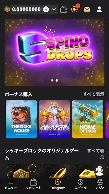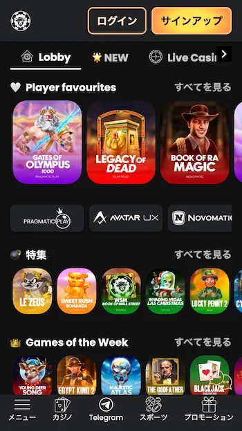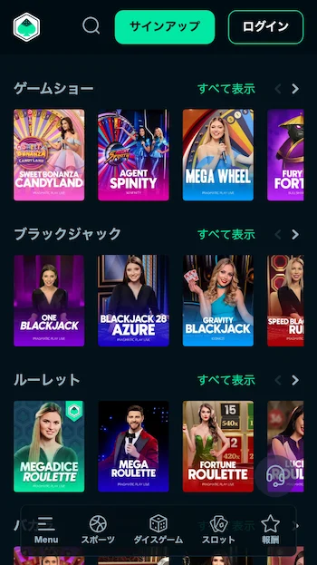 スロットやライブカジノ、テーブル、クラッシュ系など多彩なジャンルを揃え、主要プロバイダーの人気作から独自開発のオリジナルゲームまで幅広く楽しめます。