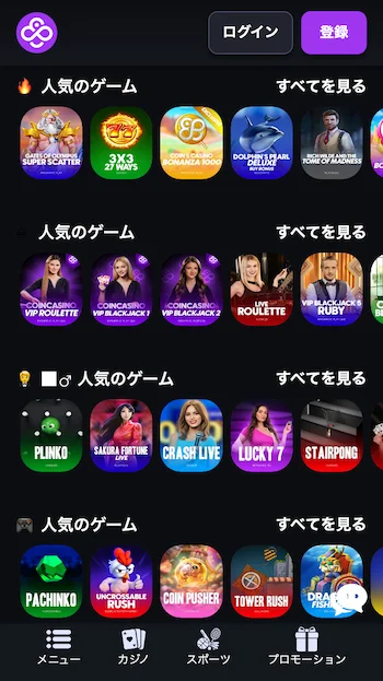 9,000以上のゲームを揃え、スロットやライブカジノ、クラッシュ系のほか、日本風の「パチンコ」も展開。