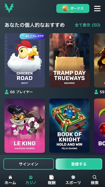 初回入金ボーナス、デイリーチャレンジなどのキャンペーンを定期的に開催され、さらに段階制のVIP制度ではプレイ量に応じて特典が上昇。継続利用するほどリワードが増える仕組みが用意されています。