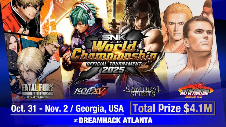 「SNK World Championship 2025 (SWC 2025)」は、SNKの格闘ゲーム4タイトルを巡ってプレイヤー同氏が競い合う大会だ。今回対象となるタイトルは『餓狼伝説 City of the Wolves』、『THE KING OF FIGHTERS XV』、『SAMURAI SPIRITS』、『ART OF FIGHTING 龍虎の拳 外伝』(龍虎の拳 外伝)の4つ。本大会は2025年10月31日から11月2日にアメリカ・アトランタでおこなわれる「DreamHack Atlanta」内で開催される。世界各地域の予選大会を勝ち抜いた招待選手と、SWC 2025内で開催される最終予選(LCQ)の上位選手が、世界No.1の座を競い合う。2024年~2025年の予選大会も合わせた賞金総額は、なんと$4,100,000以上となっている。これは現在確認できる時点では、格闘ゲームの賞金制大会としては破格の金額である。